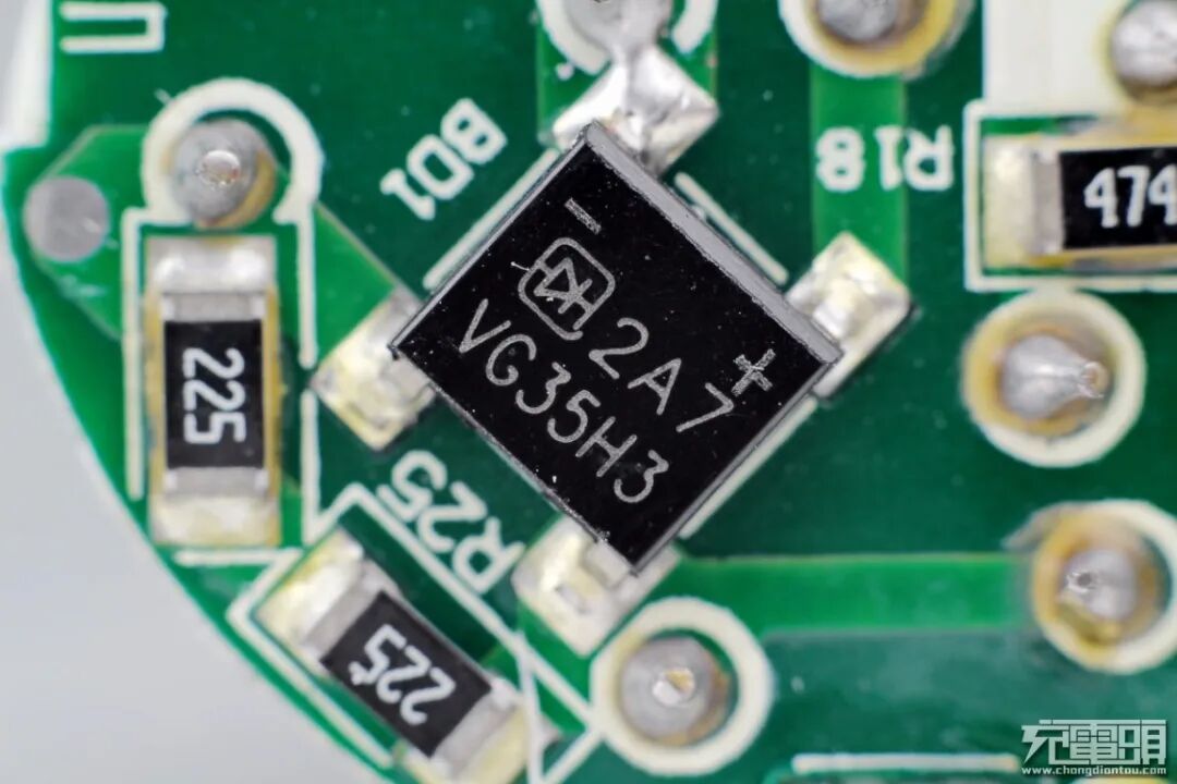 板子背面设有整流桥和PWM主控芯片,输入端有一颗贴片保险丝。