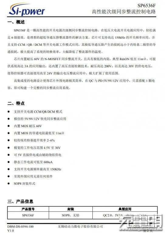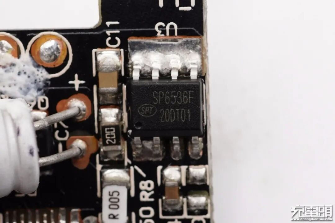 同步整流芯片采用无锡硅动力SP6536F。这是一颗高性能的开关电源次级侧同步整流控制电路,在低压大电流开关电源应用中,轻松满足6级能效,是理想的超低导通压降整流器件的解决方案。