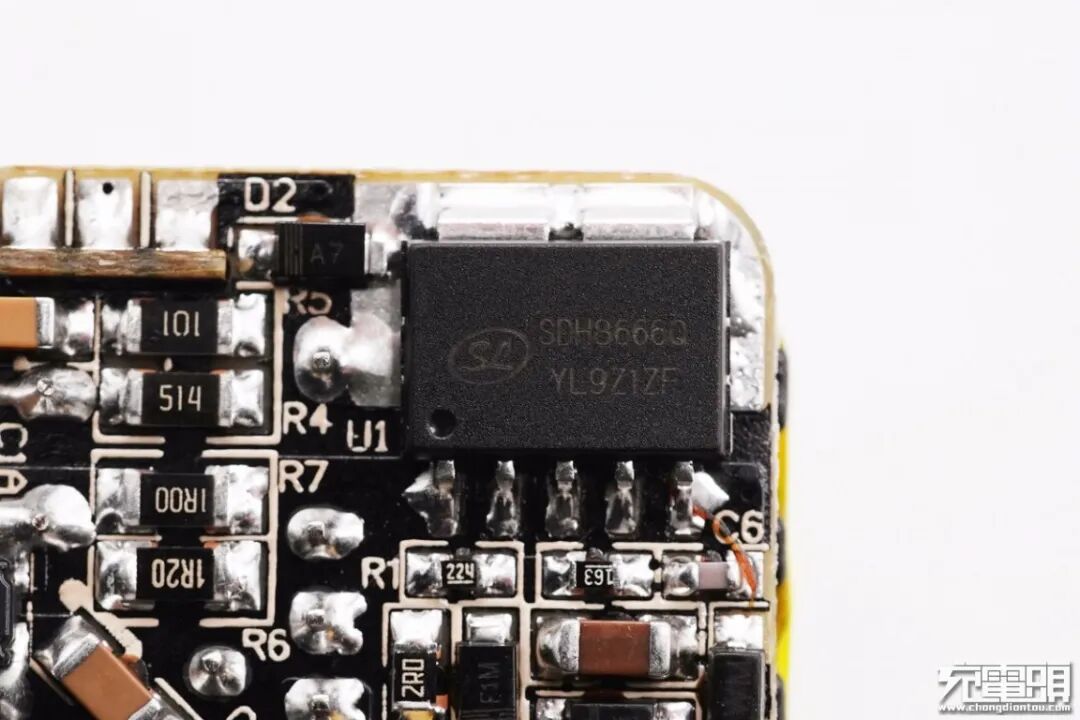 充电器主控芯片采用Silan士兰微SDH8666Q。该系列产品是士兰微电子新一代SSR反激控制芯片,采用了自有专利EHSOP5贴片封装,内置高压大功率MOSFET,导阻0.55Ω,可广泛适用于36W适配器或48W开放环境,包括通用适配器、快充、显示器和平板电视等,此前充电头网已经对该款芯片进行相关报道。