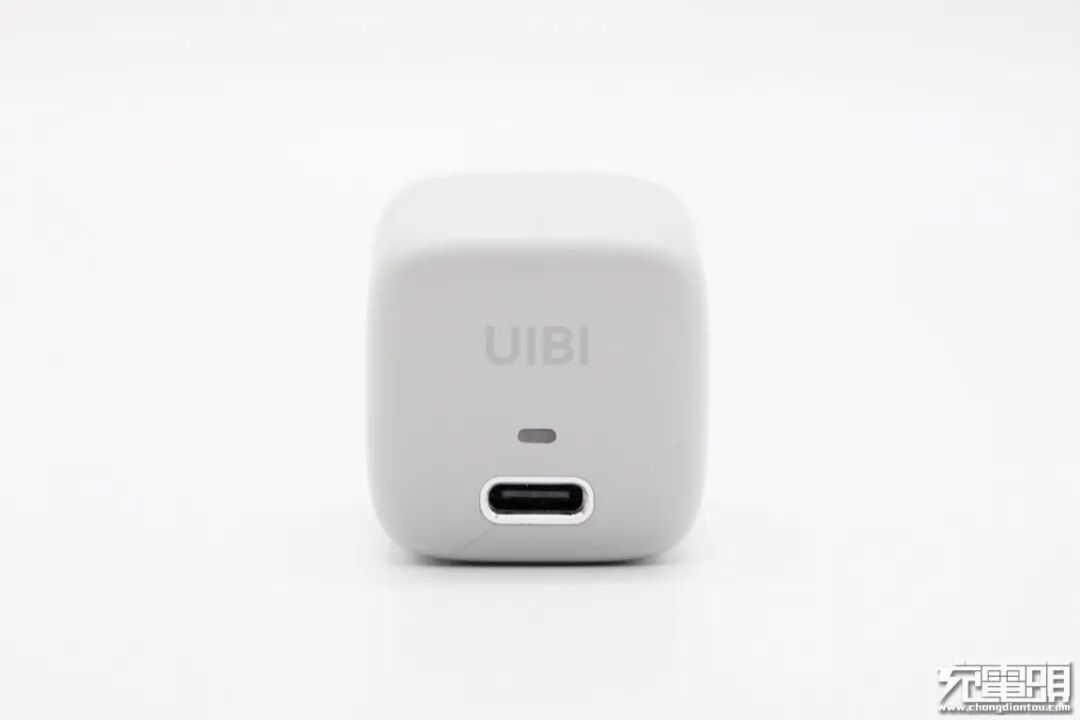充电器采用立体小方块造型设计,机身壳表面哑光处理,边角过渡圆润。输出顶部配有USB-C接口和LED指示灯,并配有UIBI品牌。接口处配有金属圈,使充电线插拔更有导向性,保护塑胶壳,防止Type-C接口露边,更能有眼球亮点,提升产品的整体气质。