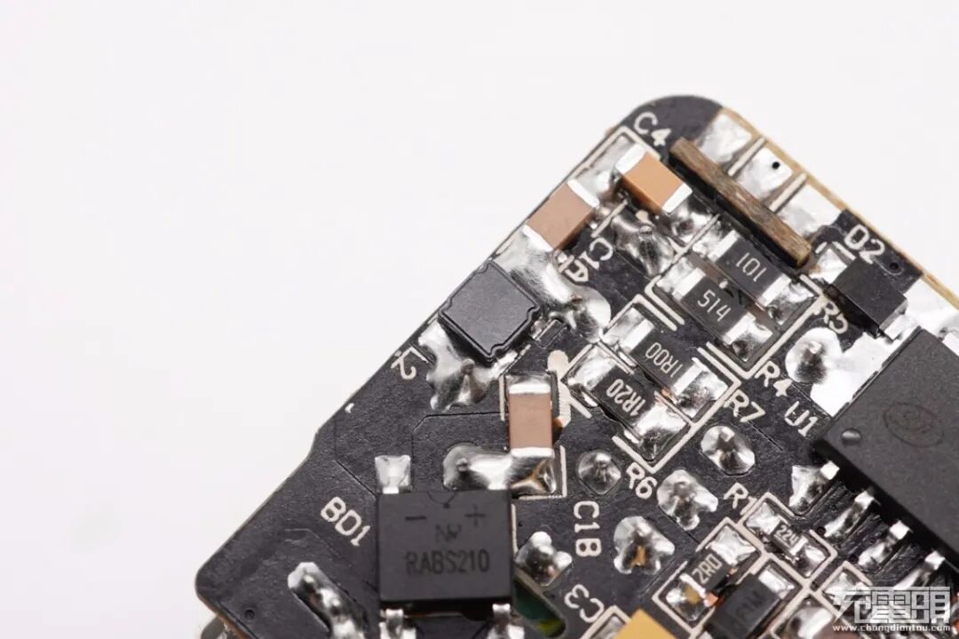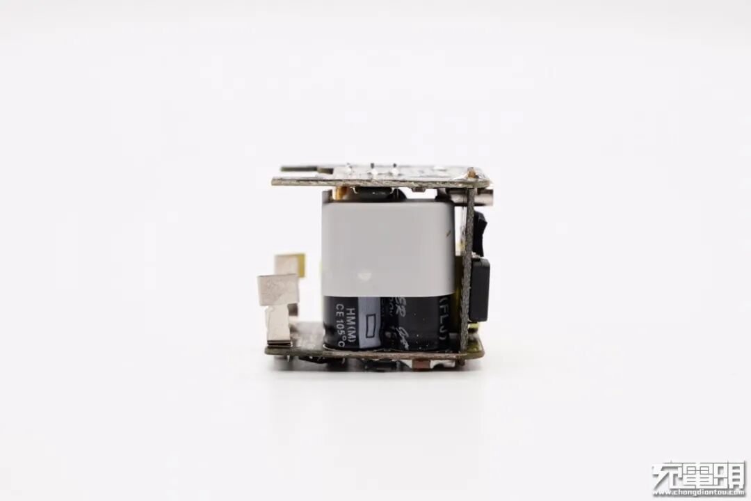 充电器内部采用“三明治”结构设计,充分利用内部空间减小体积,初次级之间设有塑料支架进行隔离固定,这也是超小型充电器的基本操作,既能起到完整的绝缘效果,又能有效支撑固定元器件,提升内部结构的机械强度。