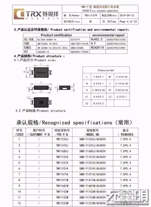 据了解,特锐祥贴片Y电容产品具备可靠性高、抗振能力强、焊点良率高、高频特性好、可减少了电磁和射频干扰等特性,同时还易于实现自动化生产,提高生产效率,节省材料、能源、设备、人力、时间成本。在满足空间集约和性能条件的前提下,整体成本比传统更有优势。可以广泛应用于消费类电子、计算机和通信、工业电器、汽车电子、新能源、航天军工等行业领域,目前已在全球范围内取得CQC认证、UL认证、VDE认证、ENEC认证,安规500V、ISO9001等相关认证。