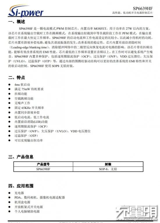 PWM主控芯片采用硅动力SP6639HF,这是一颗电流模式PWM控制芯片,内置功率MOSFET,使用 SOP8无铅封装,用于功率在27W以内的方案。