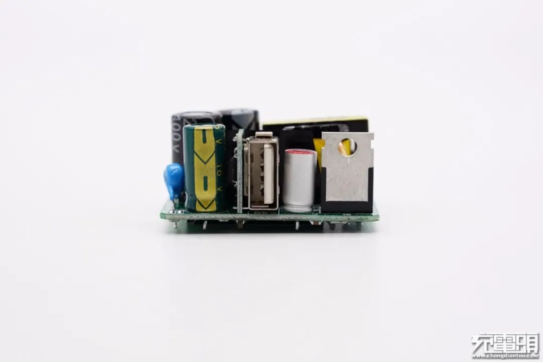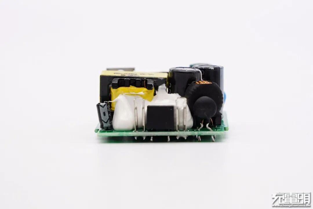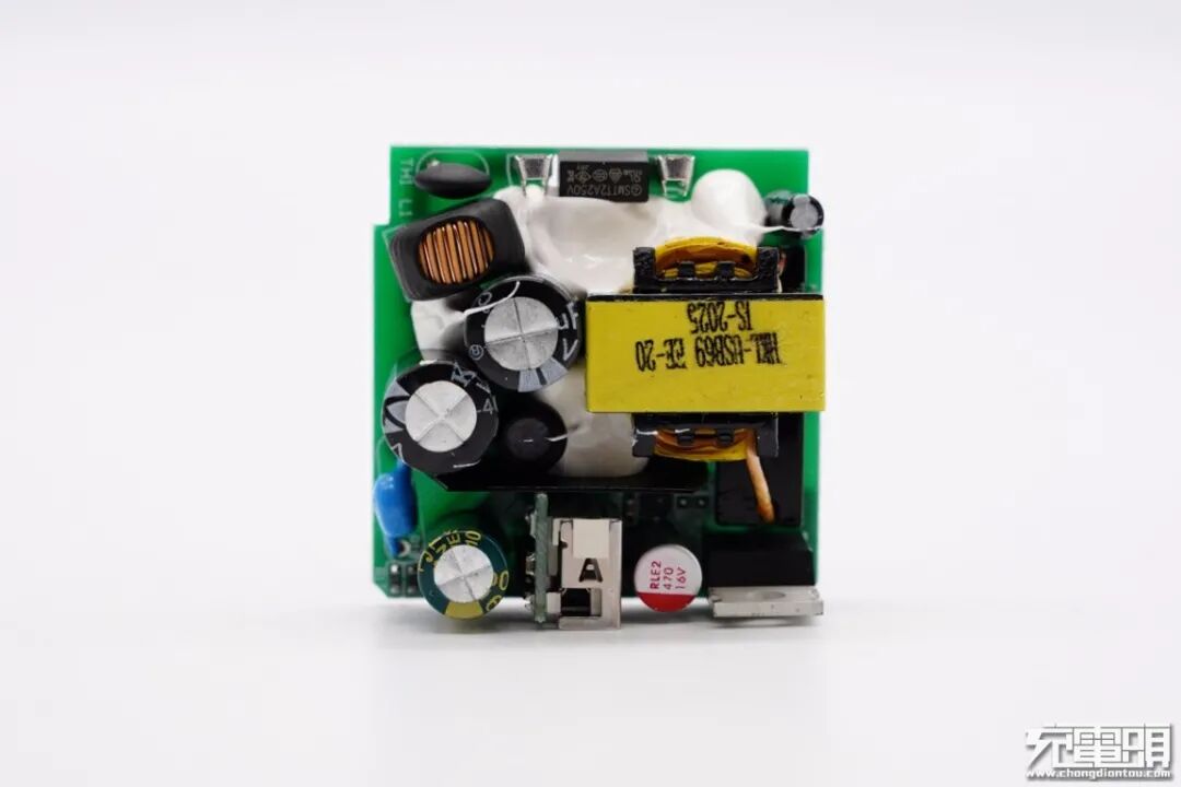 PCB板正面一览,输入端上电感电容以及变压器等打胶固定,初次级之间设有黑色隔离板,USB-A母座使用小板垂直焊接。