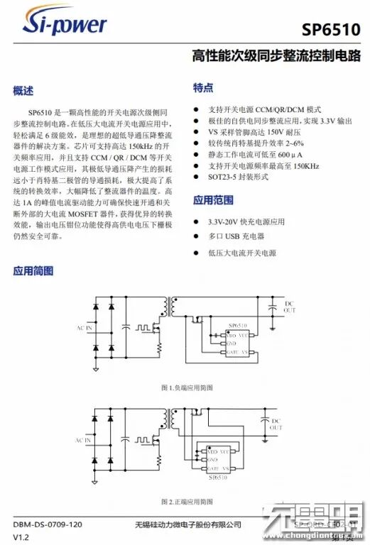 硅动力SP6510是一颗高性能的开关电源次级侧同步整流控制电路。在低压大电流开关电源应用中, 轻松满足6级能效,是理想的超低导通压降整流器件的解决方案。芯片可支持高达150kHz的开关频率应用,并且支持 CCM/QR/DCM等开关电源工作模式应用。