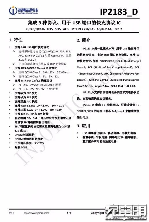 英集芯IP2183详细规格资料。充电头网了解到,英集芯的快充芯片此前已被诺基亚7原装充电器、小米9手机27W原装充电器、京东京造18W USB PD充电器、华为CP07迷你移动电源、公牛移动电源等多款产品采用,并获得市场高度认可。