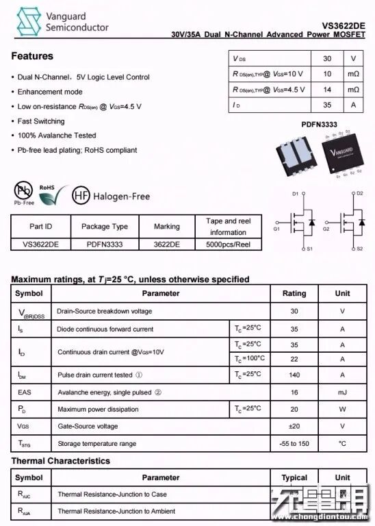 威兆VS3622DE双NMOS管,耐压30V。
