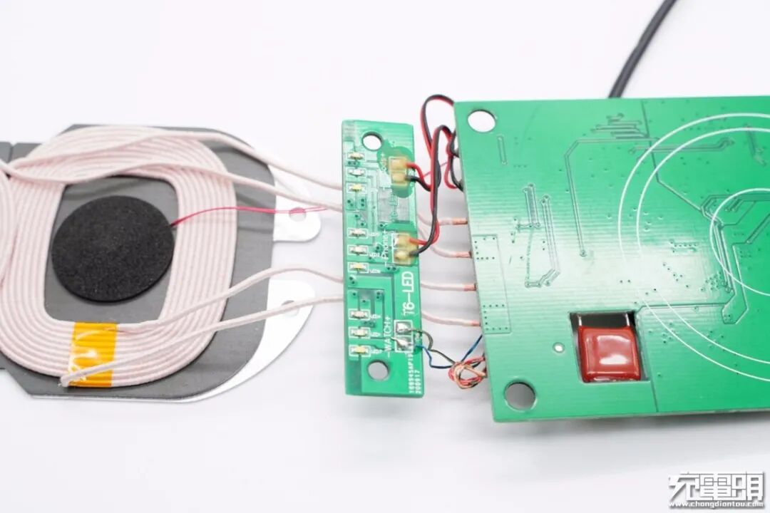 无线充主板正面一览,线圈焊盘和电容打胶固定。