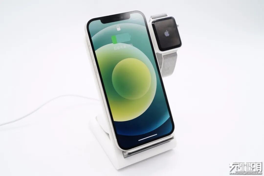 产品使用一览,支撑板上放置手机和手表,值得一提的是,手机横竖都能进行无线充电。