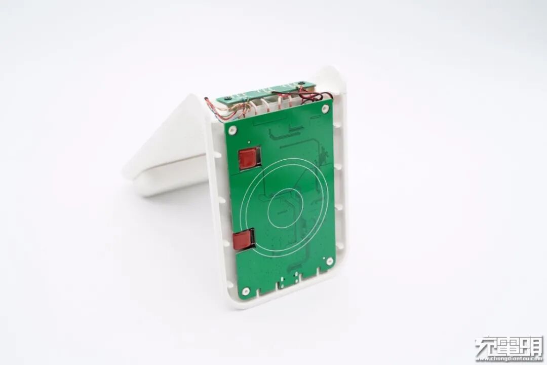 机身壳采用底座螺丝和边缘卡扣进行固定,支撑板内设有两个无线充电线圈。