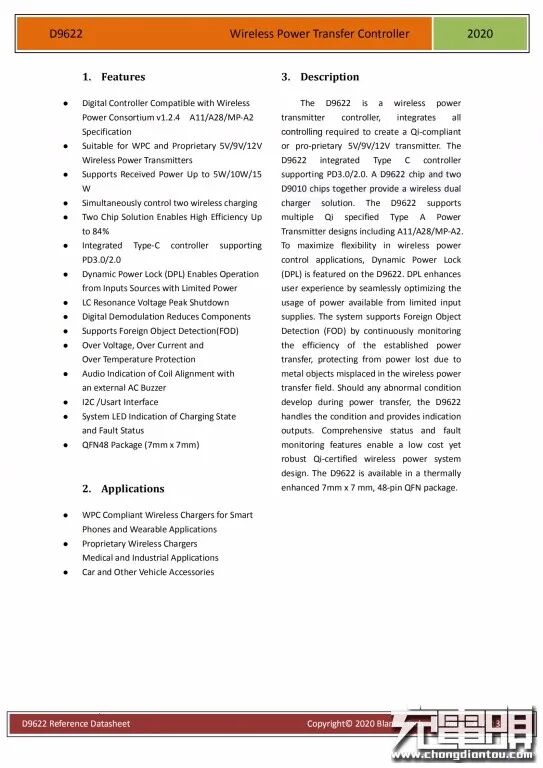 手机和耳机无线充主控芯片采用贝兰德D9622,这是一款全同步数字解调无线充TX芯片,其具有如下特点: