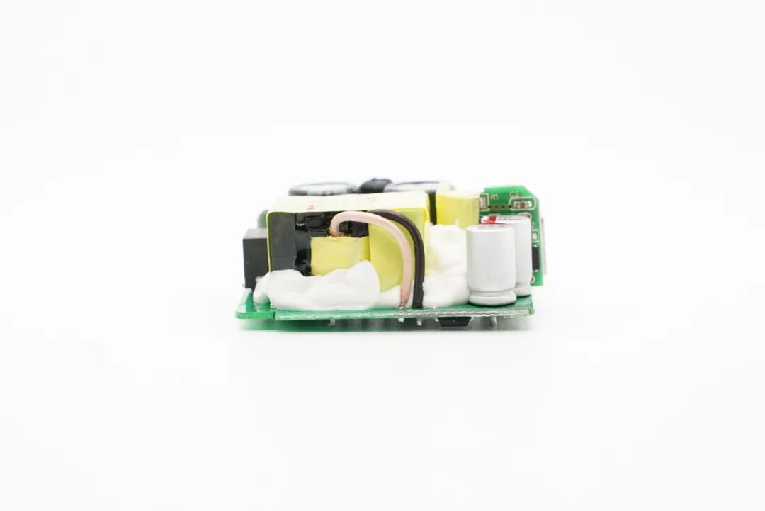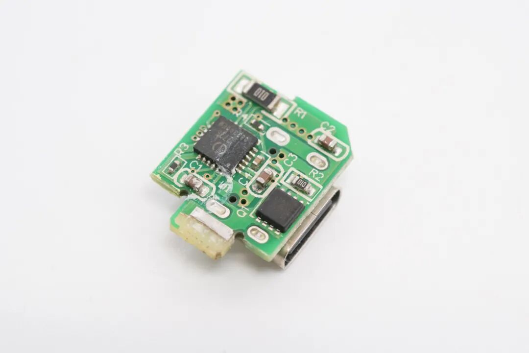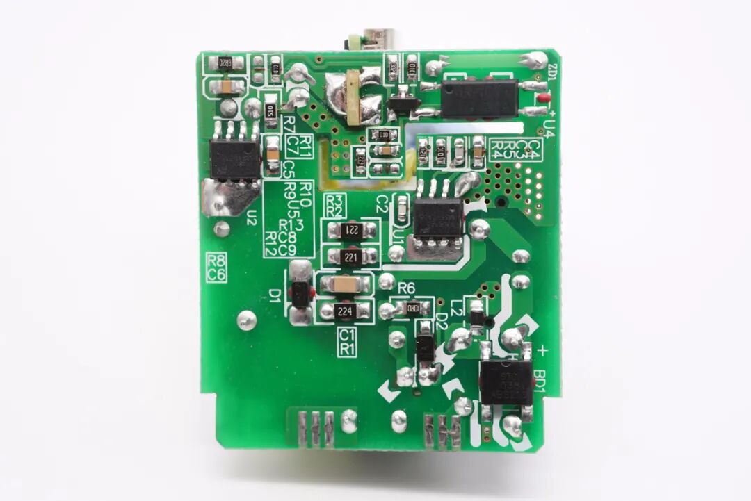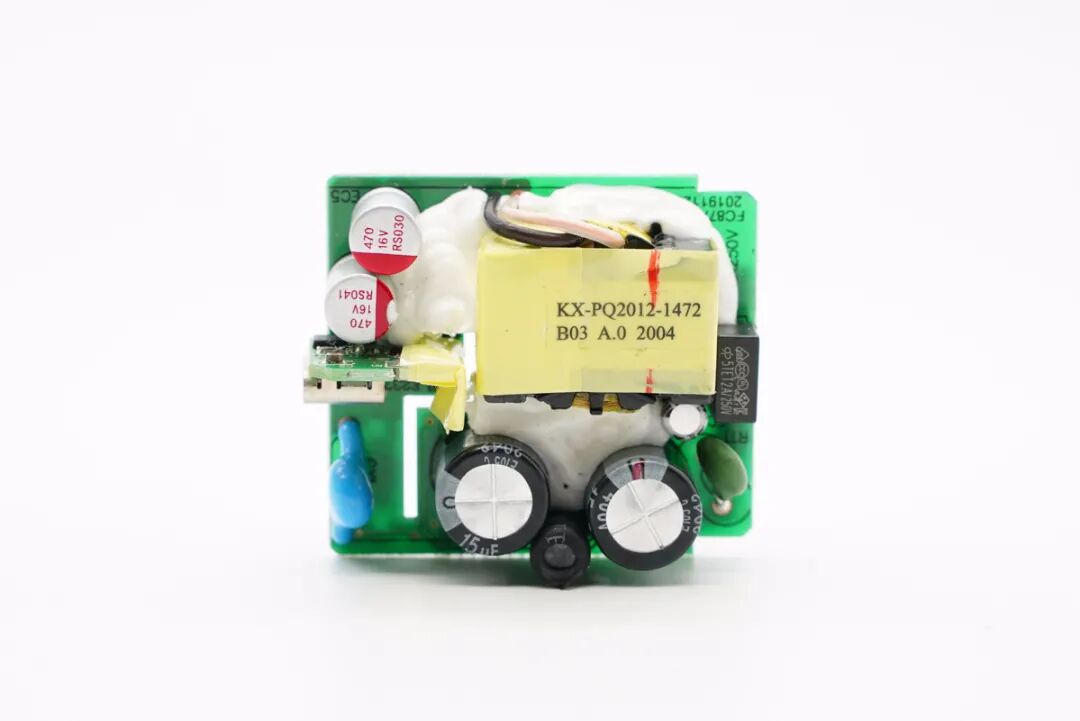 PCB板正面一览,USB母座使用协议小板垂直焊接,而且靠近变压器一端还缠绕绝缘胶带,变压器和电容等元器件打胶处理。
