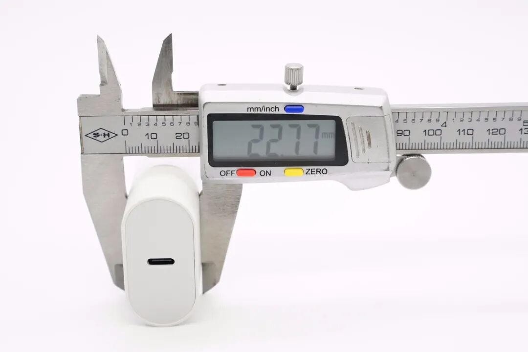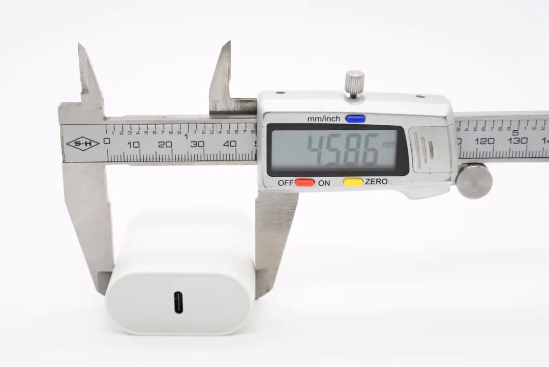 使用游标卡尺实测充电器机身长度为45.67mm。