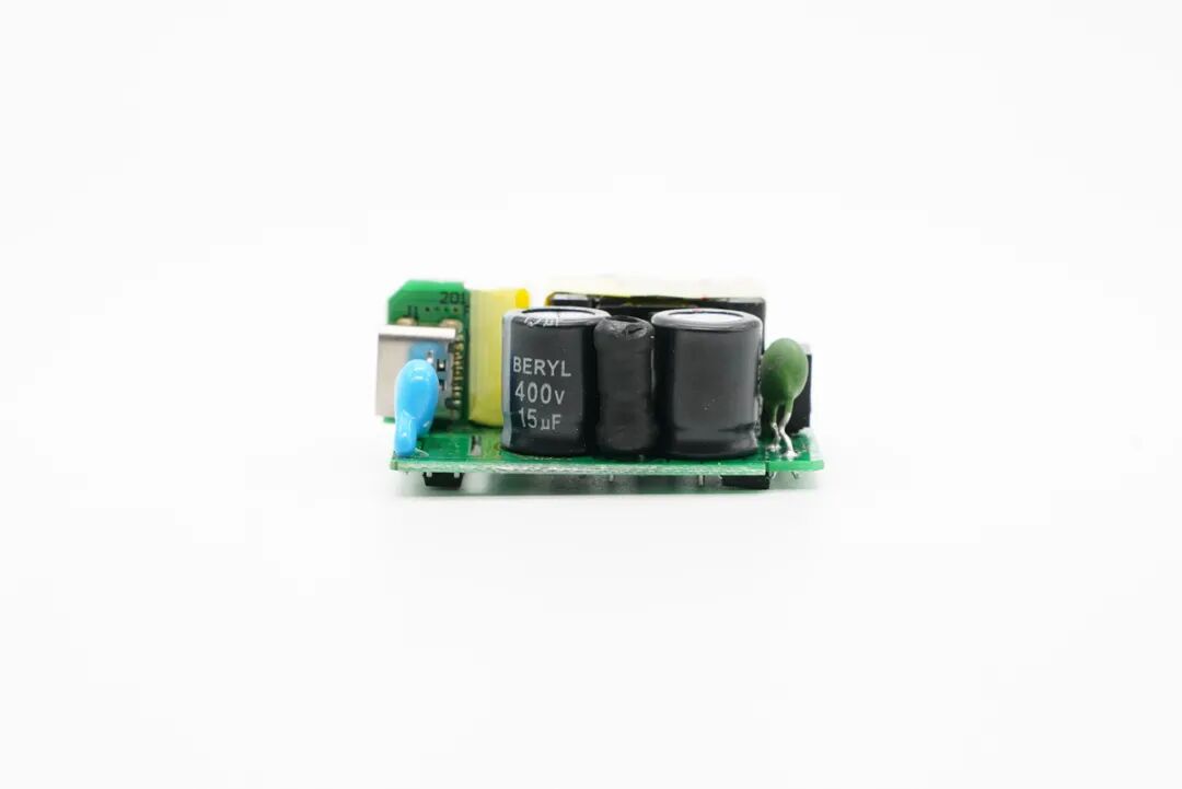 输出端一览,USB母座焊接在协议小板上,右侧是Y电容,左侧是两颗同步整流输出滤波固态电容。