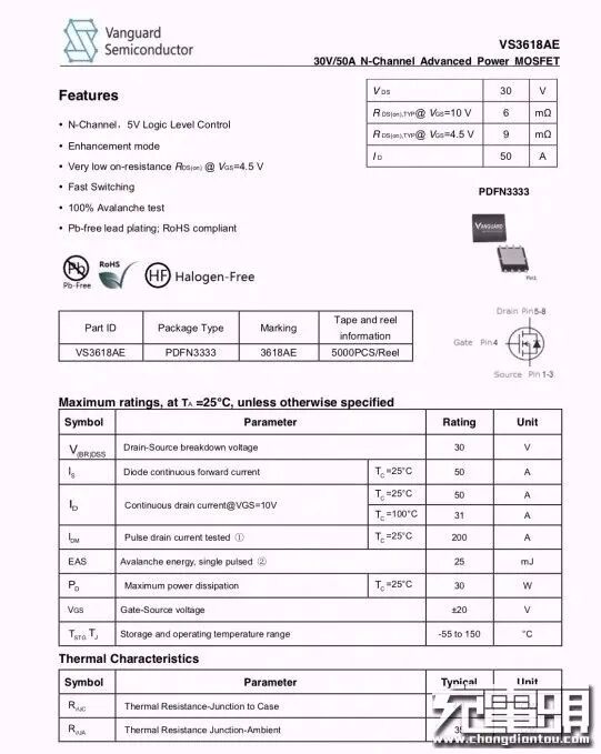 输出VBUS开关管采用威兆半导体VS3618AE,NMOS,耐压30V,导阻6mΩ。