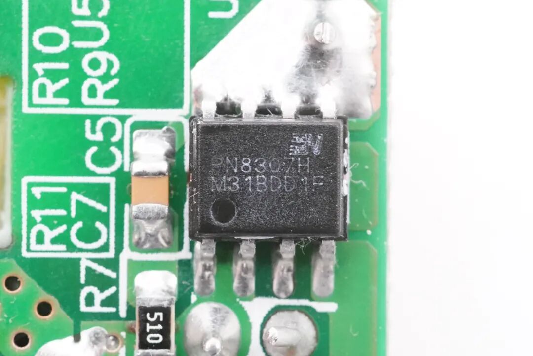 和PWM主控芯片搭配的是芯朋微PN8307H次级同步整流芯片。PN8307H内置同步整流控制器及高雪崩能力功率MOSFET,用于在高性能AC/DC反激系统中替代次级整流肖特基二极管,导通压降极低的功率MOSFET可以提高电流输出能力,降低温升,提升转换效率,使得系统效率可以满足6级能效的标准,并留有足够的裕量。