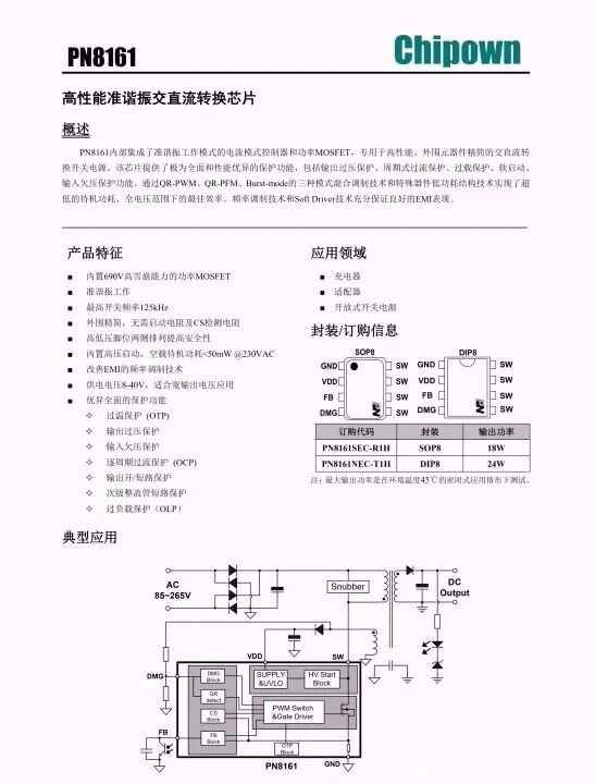 PWM主控芯片PN8161来自Chipown芯朋微。该芯片内部集成了准谐振工作的电流模式控制器和功率MOSFET,专用于高性能、外围元器件精简的AC-DC开关电源。该芯片提供了极为全面和性能优异的智能化保护功能,包括输出过压保护、逐周期过流保护、过载保护、软启动功能。