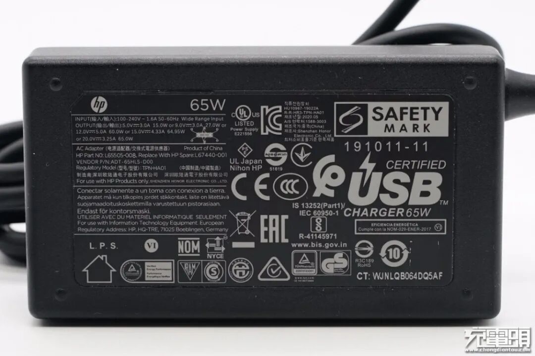 充电器支持PD3.0快充,具备齐全的电压档位,同时自带有USB-C输出线缆,方便用户使用。产品已经通过了多个国家或地区重要机构的认证,全球各个地区都能使用,可见惠普笔记本电脑在全世界都是相当受欢迎的。那么下面我们就对这款充电器进行拆解,看看其做工用料如何。