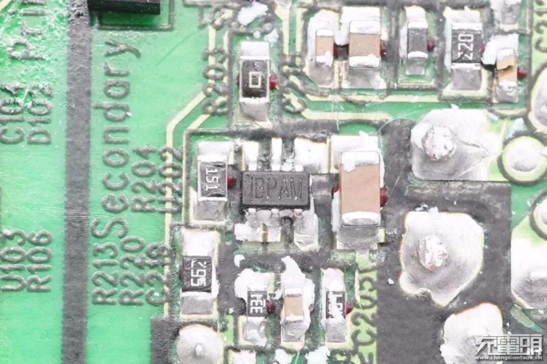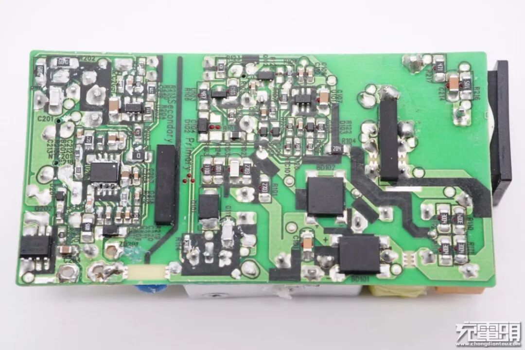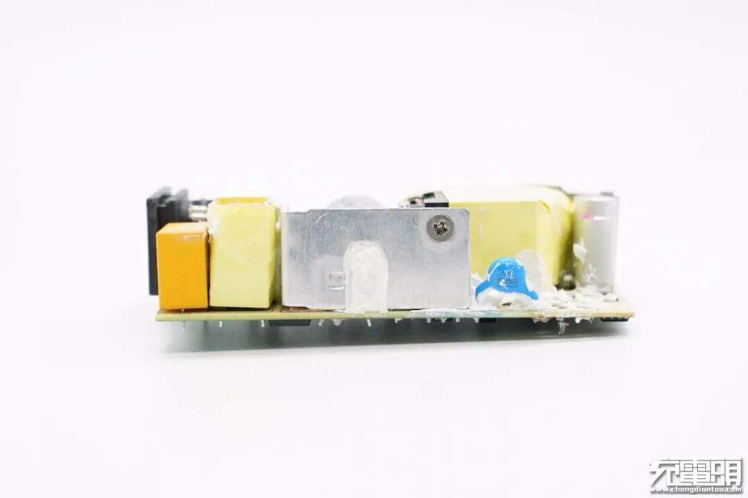 PCB板另一侧一览,高压滤波电解电容横置,初级侧仅使用一颗进行滤波,因此个头很大。此外左边还有主控芯片供电电容、变压器和光耦。