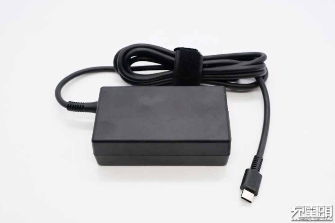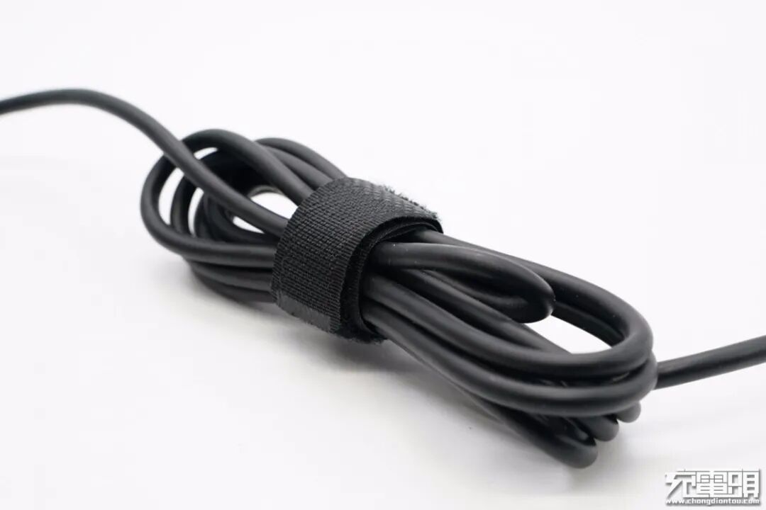 产品采用典型的笔记本电源适配器设计风格,长方体机身表面磨砂处理,边角过渡圆润,自带的USB-C输出数据线使用魔术扎带捆扎,方便整理。