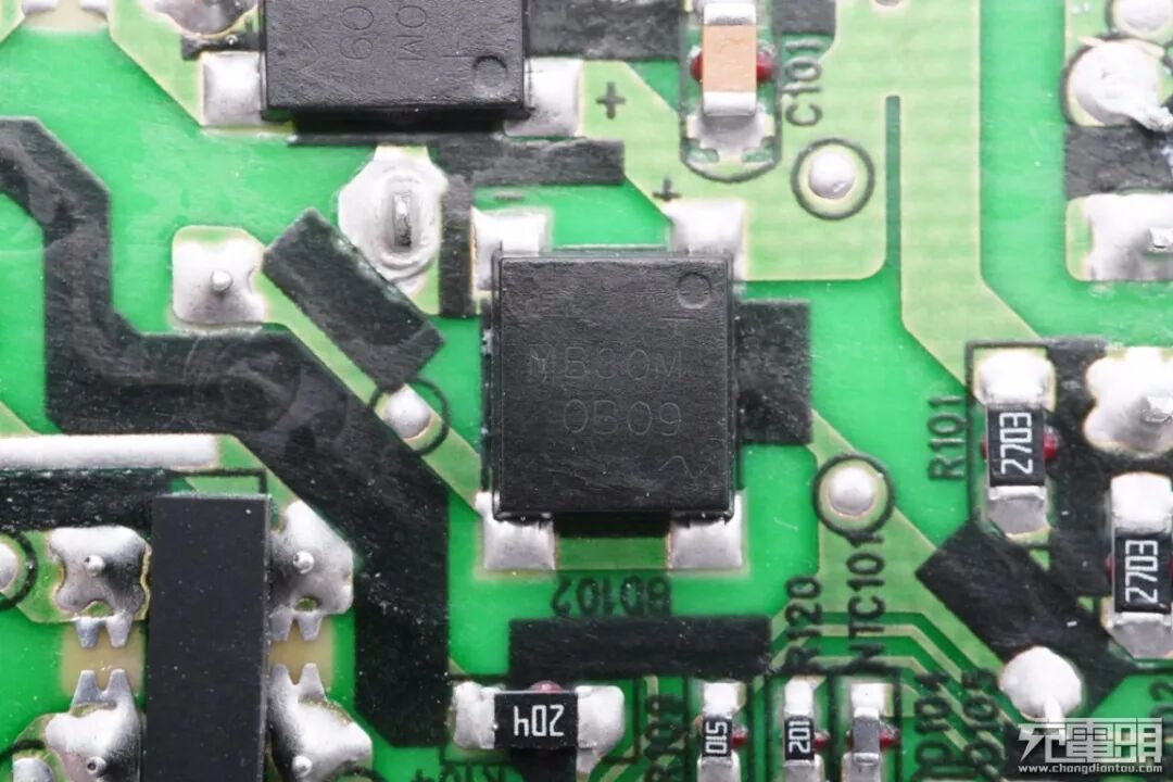 输出VBUS开关管特写,丝印21N03P。