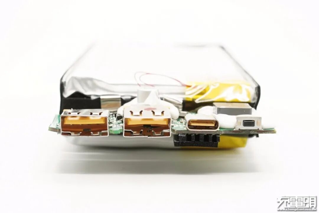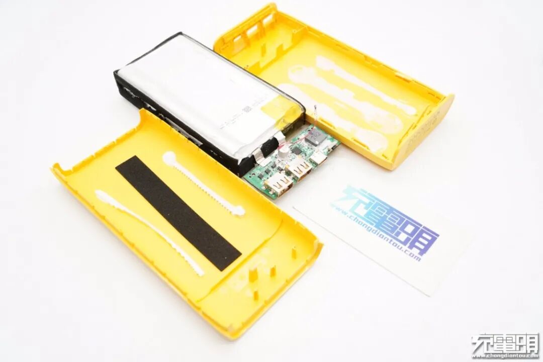 移动电源采用两块电芯并联,单块规格为3.7V/10000mAh/37Wh,充电限制电压4.2V。