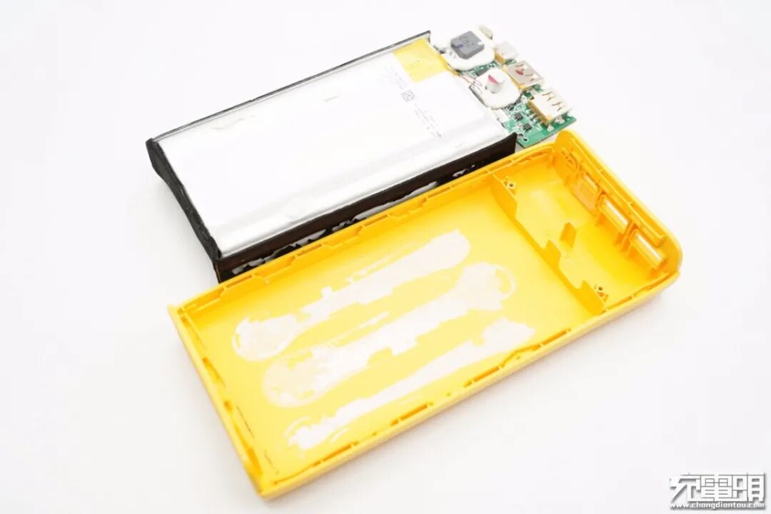 另一半机身壳上也打胶处理,同时设有一体隔离板将PCB板和电芯隔离。