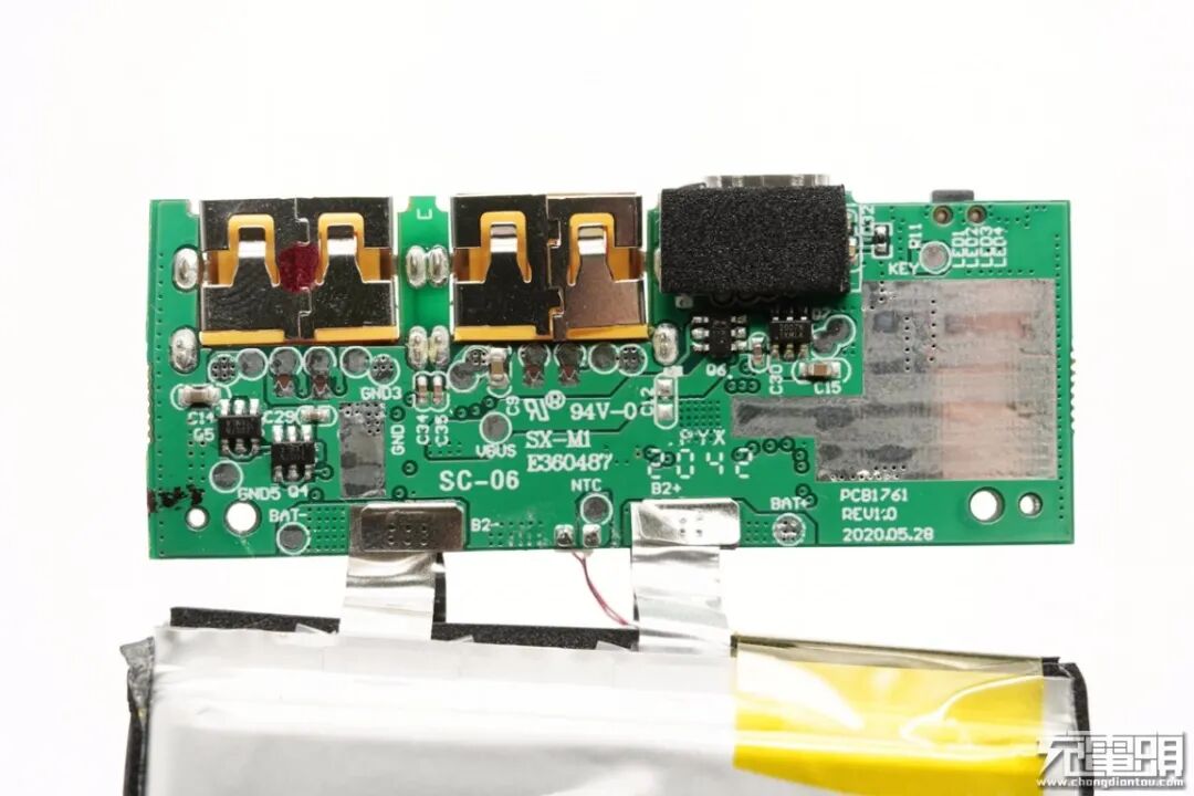 充电头网通过拆解了解到,移动电源内置两块10000mAh电池并联,侧面均贴有泡棉胶保护同时还打胶固定,和PCB板点焊连接,配有热敏电阻和赛芯微XB7608A进行过热、过充过放保护。产品采用智融SW6201双向快充移动电源专用多合一芯片,具备多种功能,性能强悍,此外电路板背面对应主控芯片区域露铜加锡处理。设有固态电容进行输入输出滤波。产品整体用料做工扎实。