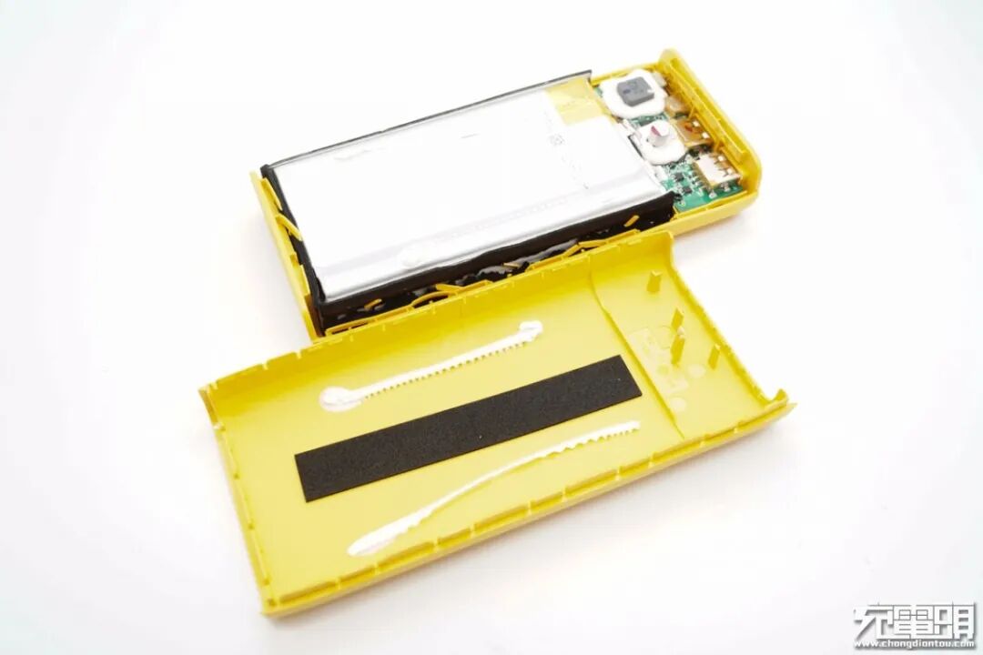将机身壳拆开,电芯侧面全部贴有泡棉胶,机身壳上打胶和贴有泡棉胶,固定保护电芯。