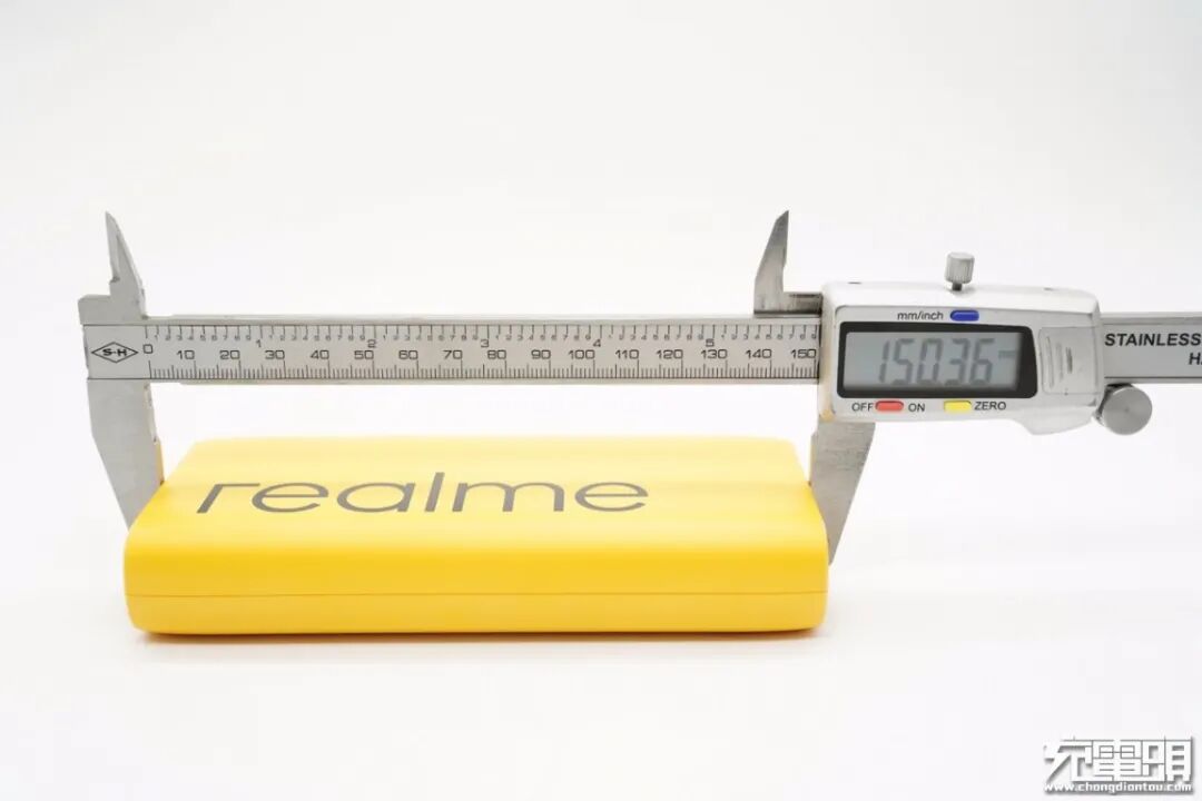 使用游标卡尺实测移动电源机身长150.36mm。