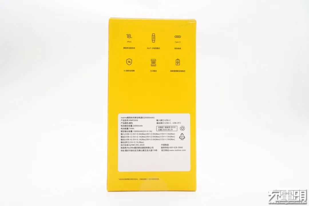 Realme真我这款移动电源采用黄色机身加黑色Realme品牌设计,一直以来Realme投放到市场的产品经常能看到黄色logo,而这款产品主体就以黄色配色,设计不仅简洁同时又凸显品牌文化。移动电源配备配备2A1C接口,均支持18W快充,且兼容QC、AFC、FCP、PE2.0、PD3.0、PPS快充协议,续航足可被大多数人群使用。