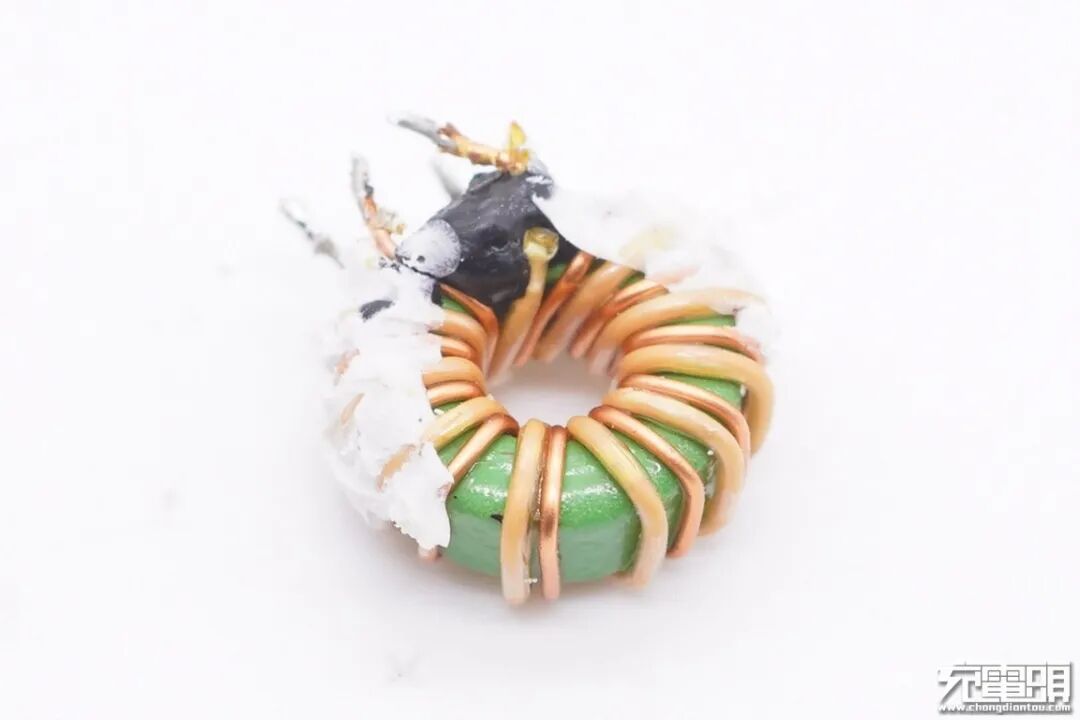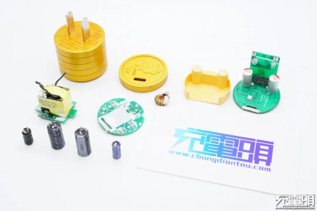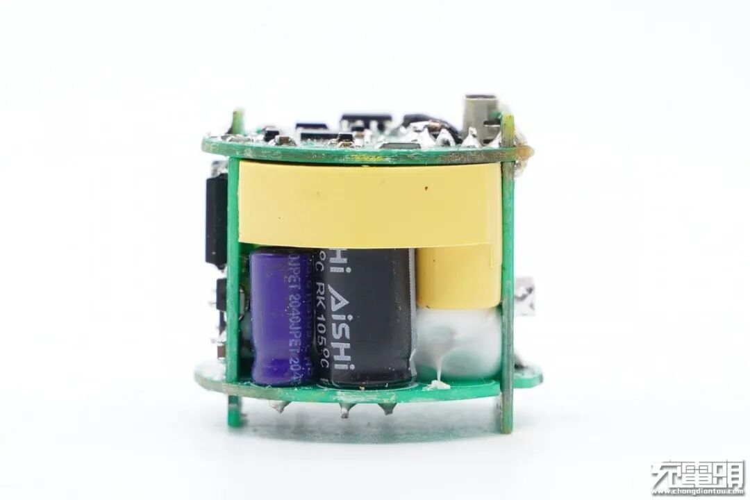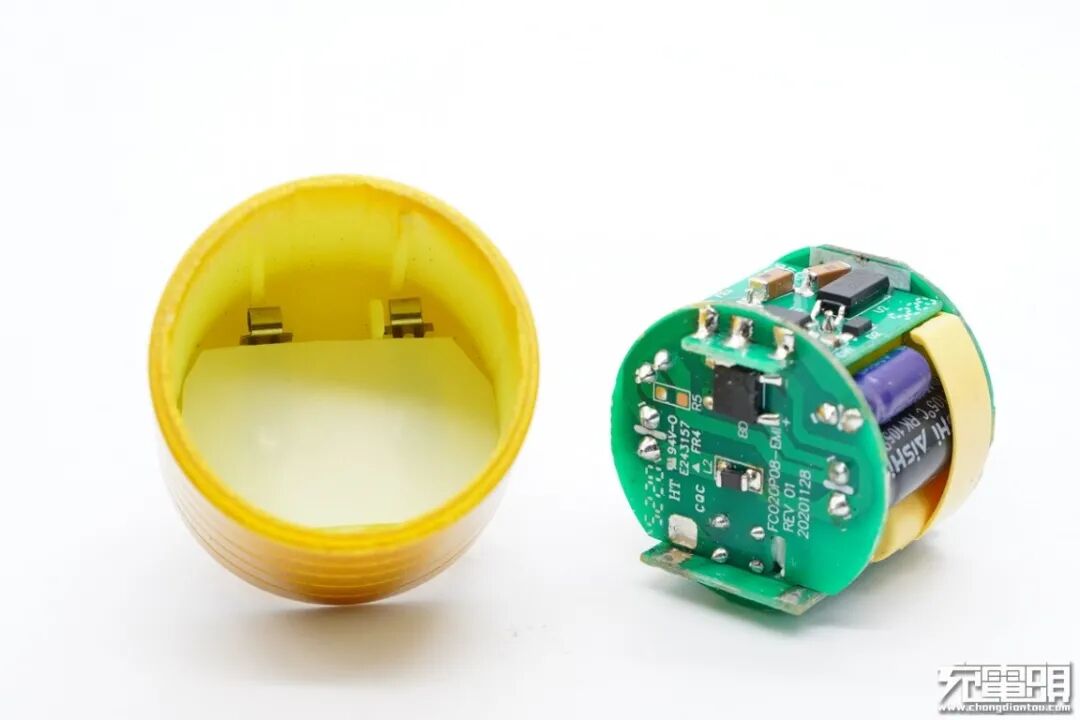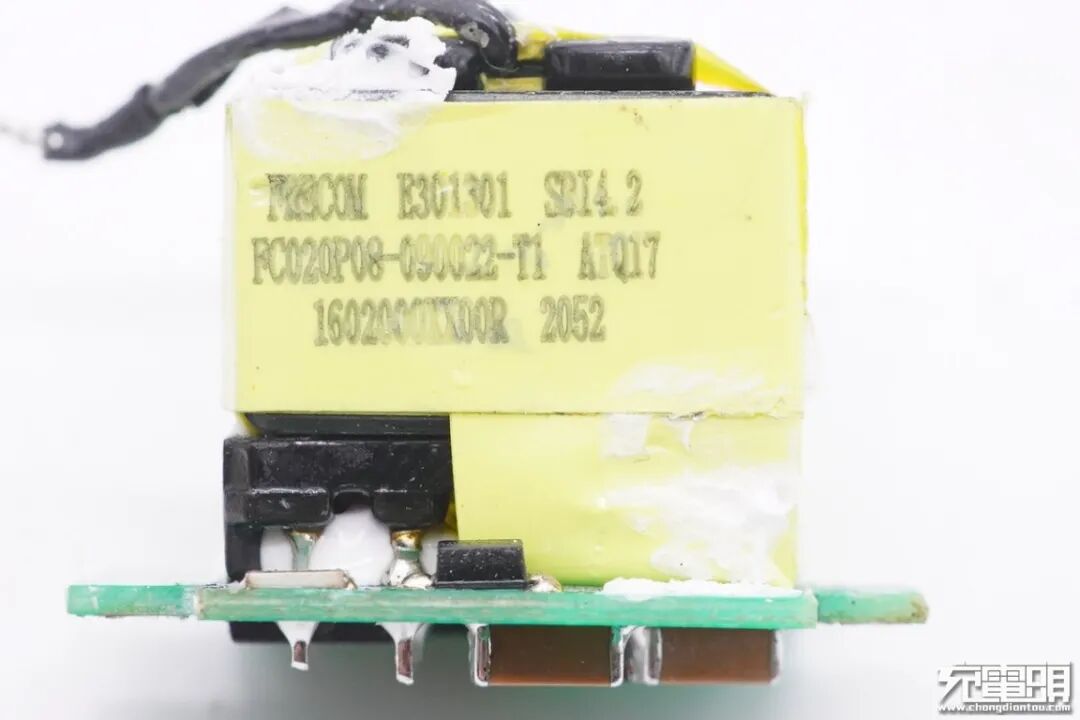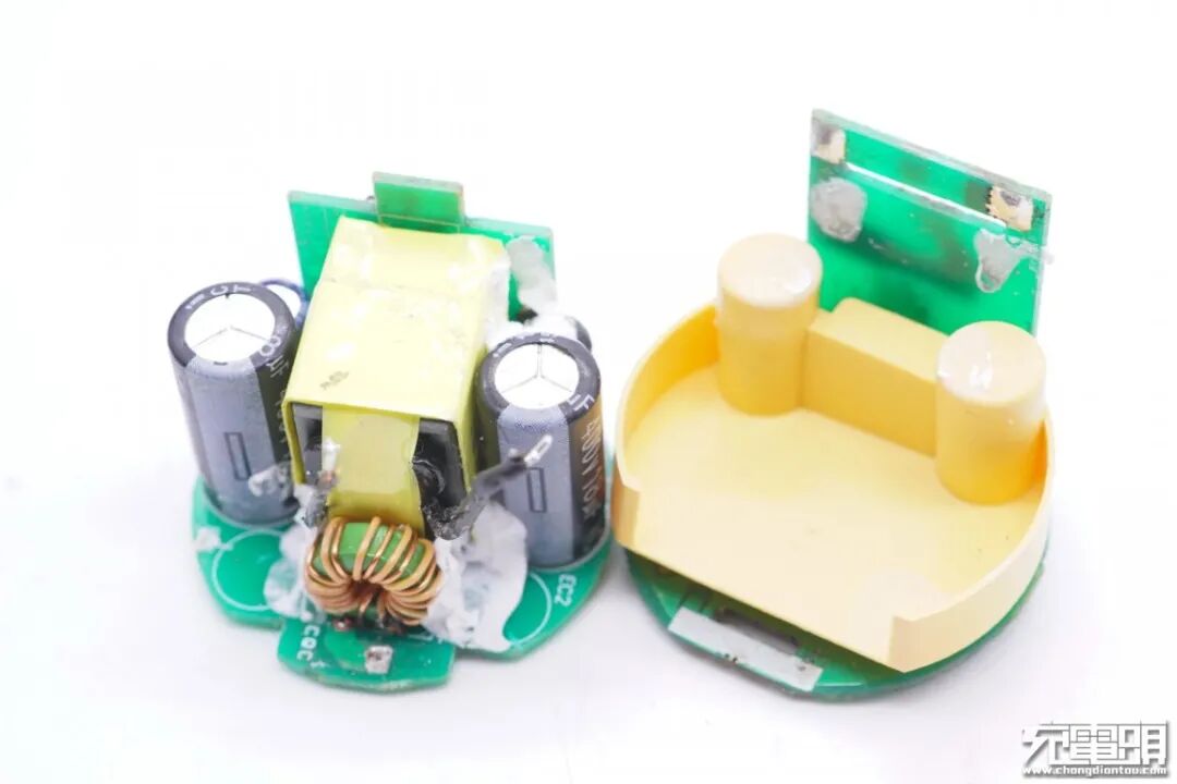 将充电器拆开,小板正面中心放置变压器,两侧是高压电解电容、工字电感、主控芯片供电电容,前端是一颗共模电感;输出端圆形小板上套有黄色塑料壳将初次级有效隔离。