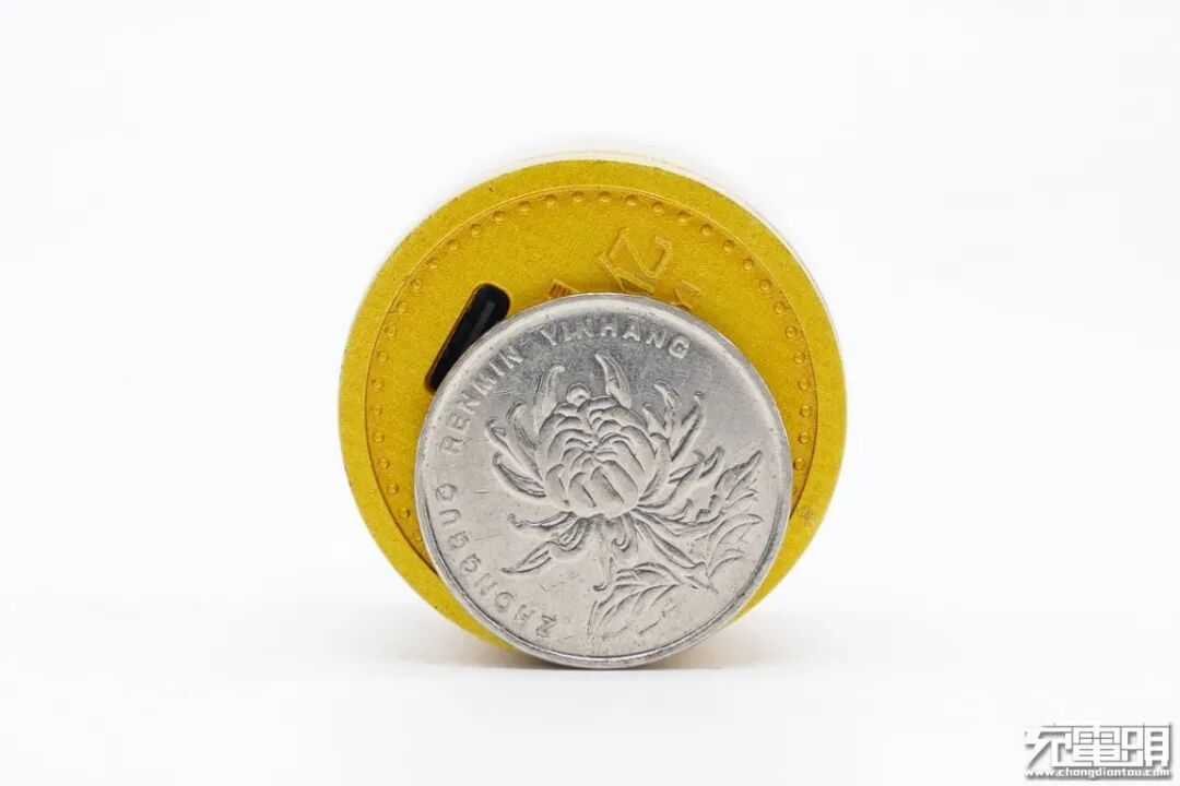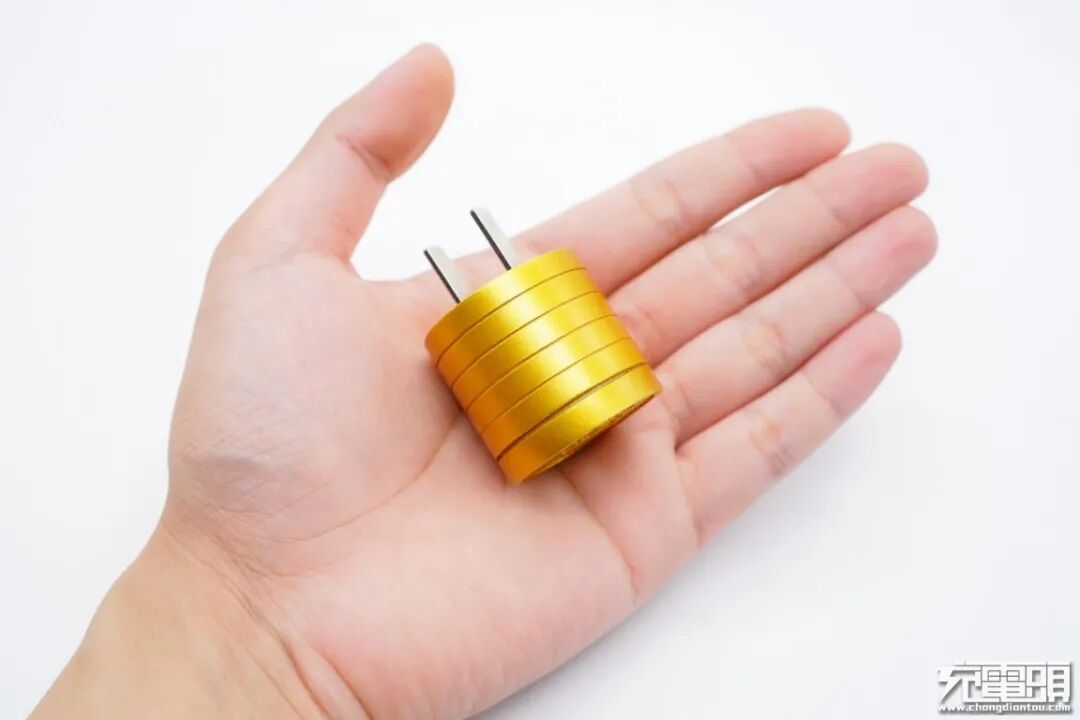 腰身等距设有五条小凹槽,使得充电器机身看上去像是由6块亿元金币叠堆而成,因此叫“快充1亿”迷你充,设计十分有创意。