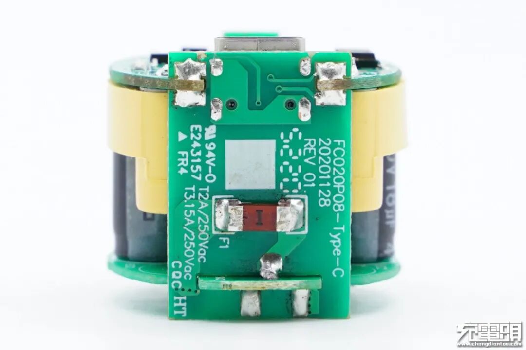 充电头网通过拆解了解到,充电器内部采用四块小板搭架焊接组成,为契合机身造型,前后端板子还设计成扇形,设计新颖独特。四块小板围成的空间内放置电容、变压器等元件,结构紧凑、扎实,初次级之间有黄色塑料隔离胶壳进行绝缘,安全可靠。