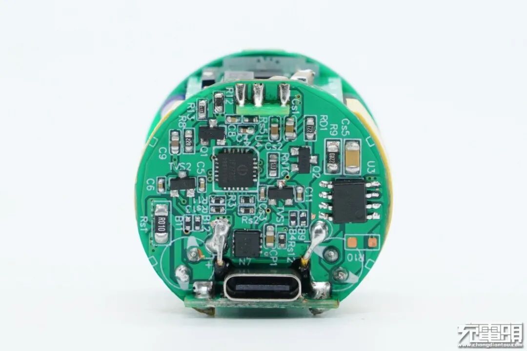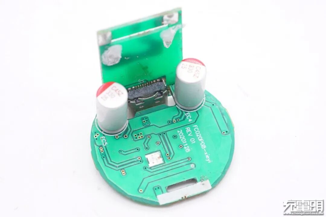输入端连接小板上设有一颗贴片保险丝,背面过孔焊接Type-C母座,将上下两个圆形小板扣紧并锡焊连接。