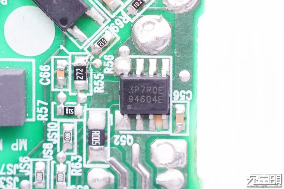 充电头主控芯片采用立锜RT7791P,支持宽电压工作,具有自适应的过电流保护,过压欠压保护,次级整流管短路保护。支持外部热敏电阻进行温度保护,芯片左侧TH1为热敏电阻,配合导热垫检测适配器温度进行过热保护。