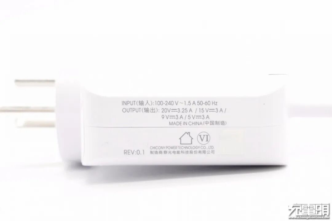 三星65W PD快充充电器采用的是三脚插脚,因此在输入端设有圆饼塑料壳,给人的第一印象便是造型独特。性能上支持纯PD快充,具备5V3A、9V3A、15V3A、20V3.25A四组电压档位,三星知名的PPS快充并没有加入进去,怎么看这都是专为笔记本设计的充电器,外带的话,低功率档位顺带可以给手机充电。