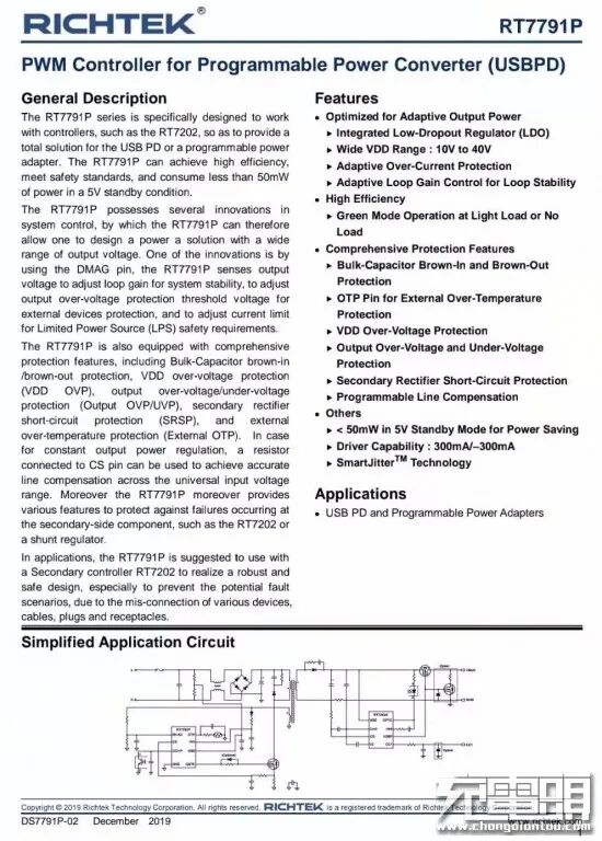 USB PD协议芯片采用立锜RT7202,支持USB PD2.0和3.0,还支持其他私有的快充协议,内部集成MCU,支持宽范围工作电压,支持自适应的过压,欠压保护和固件编程的过电流保护。