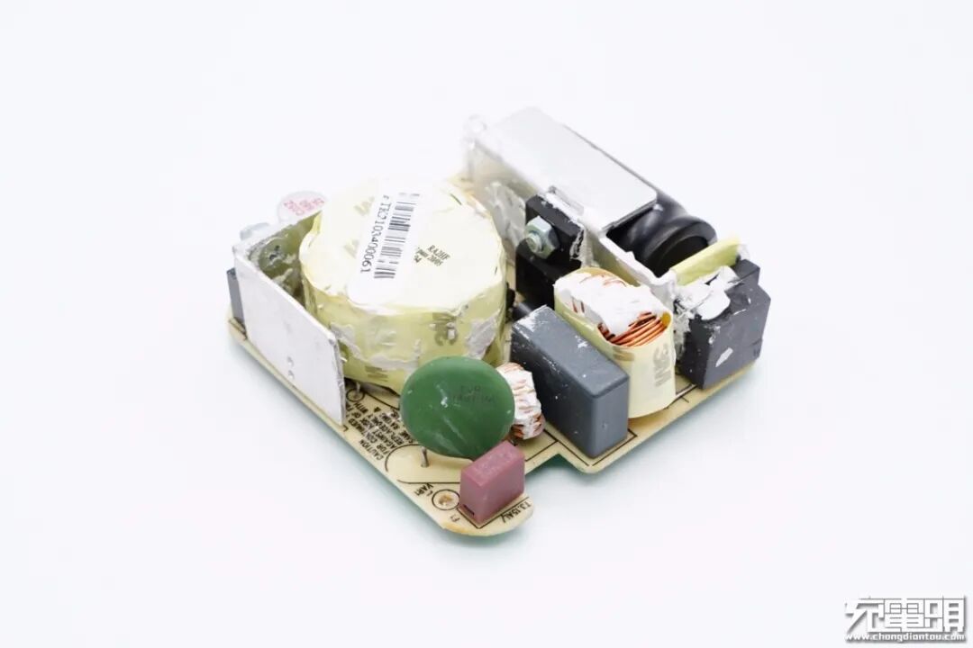充电头网通过拆解发现,由于定位是一款笔电充电器,设计上为应对大功率充电带来的发热问题,电路板上元器件分布稀疏,避免积热;同时外围输入铝片,整流桥、初级开关MOS、次级同步整流管这些主要发热器件配有专门的散热片,主控芯片贴上导热垫,同时根据导热垫的温度进行温度保护。