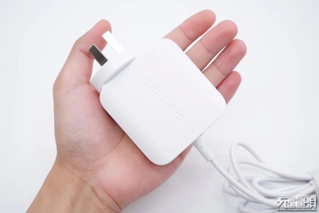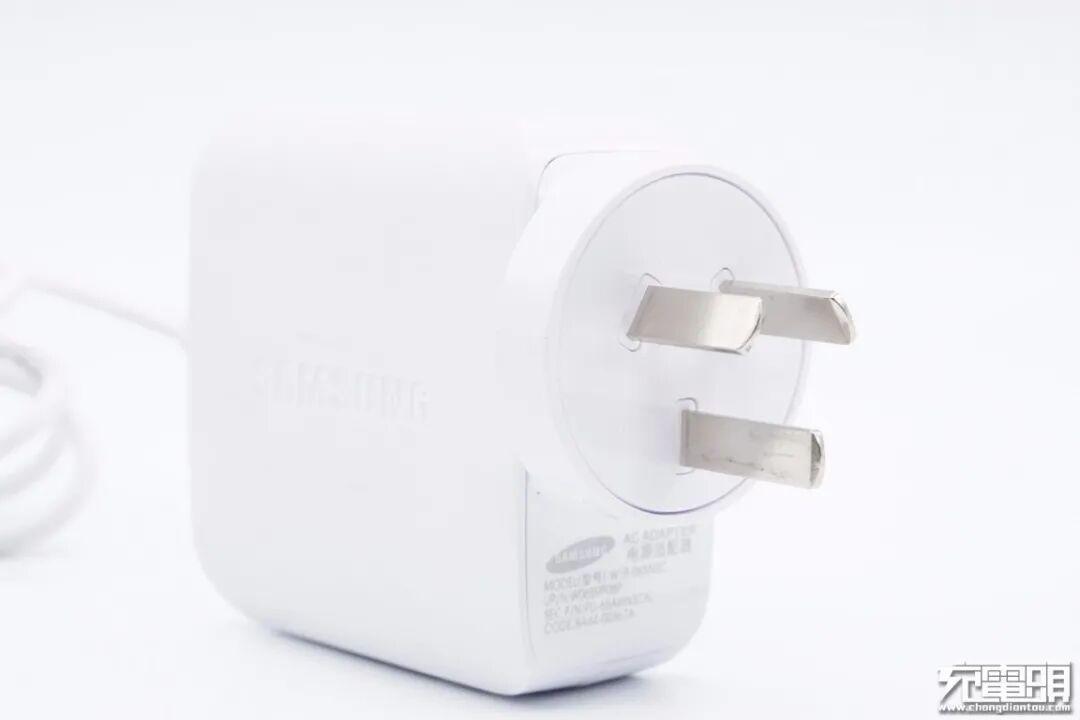 充电器采用PC阻燃材质白色外壳,表面磨砂处理,机身上凹印SAMSUNG品牌,此外设有LED指示灯。