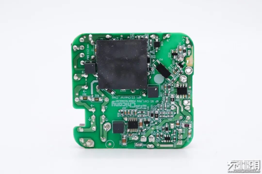 板子背面有三个方块胶垫支撑,导热垫覆盖的是充电器主控芯片,初次级分界明显。