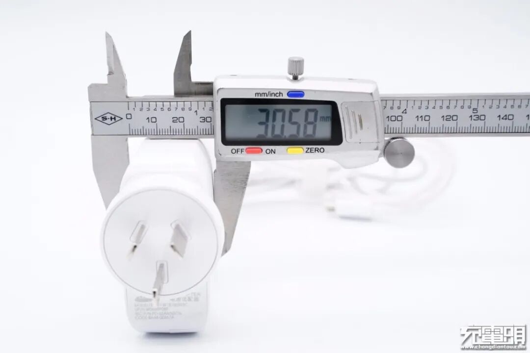 使用游标卡尺实测充电器机身加插头总长度为77.01mm。