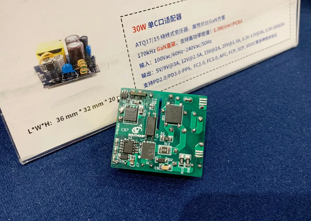 基于SC3021D、SC3503、SC2151A三颗芯片开发的30W氮化镓单口快充方案。兼容协议多,电压档位齐全,性能强悍。该方案下PCB板尺寸仅为36*32*20mm,功率密度为1.3W/cm³,高功率密度是其另一大特点。
