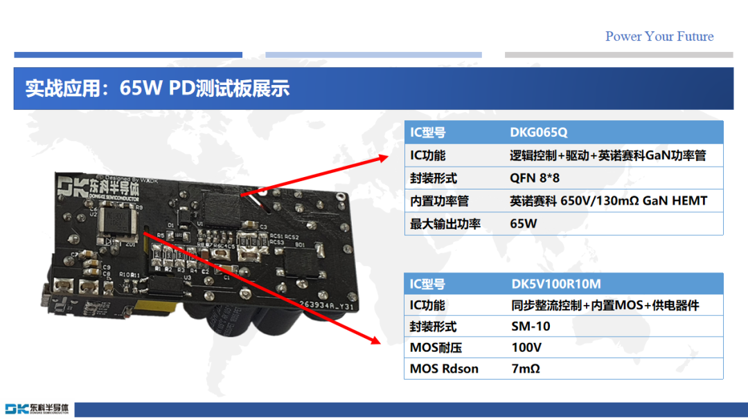 目前必易微电子已经根据KP2202开发出了一套65W氮化镓快充参考设计,得益于芯片内置驱动,外围电路精简,可搭配市面上主流的GaN功率器件开发高频、高效、高功率密度的氮化镓快充方案。