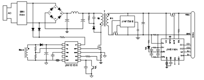 杰华特JW1515H电流检测采用负电压采样技术,最大限度减小驱动回路满足高频应用;可选且可调的OCP与OPP功能,针对不同PD输出规格,可以选择最合适的保护功能,无需增加外围器件即可满足LPS要求;同时具备高压启动、X-cap放电、独立外部OTP功能,轻松应对多重需求。