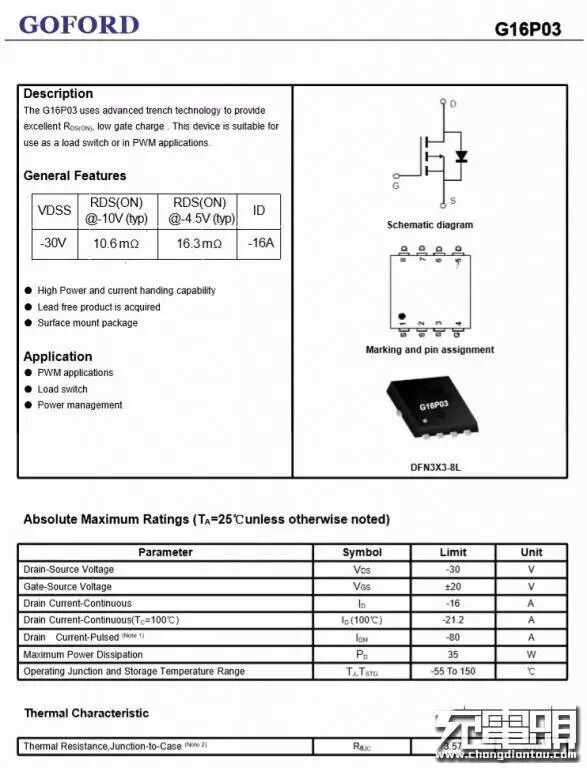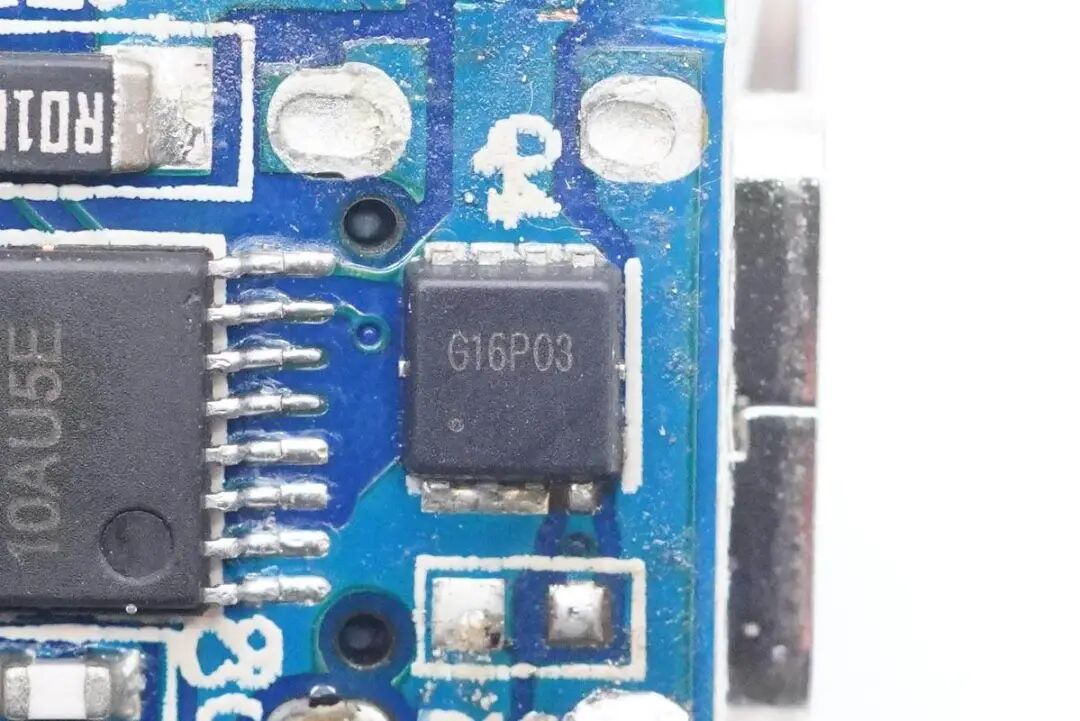 输出USB-A口VBUS开关管采用谷峰G16P03,PMOS管,耐压30V。