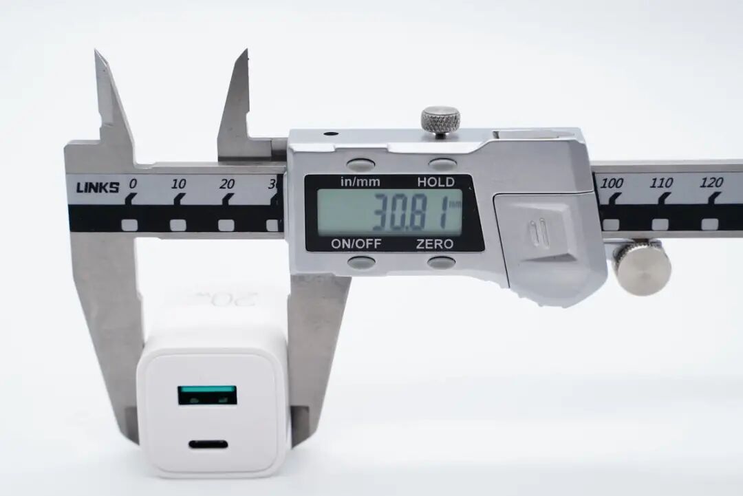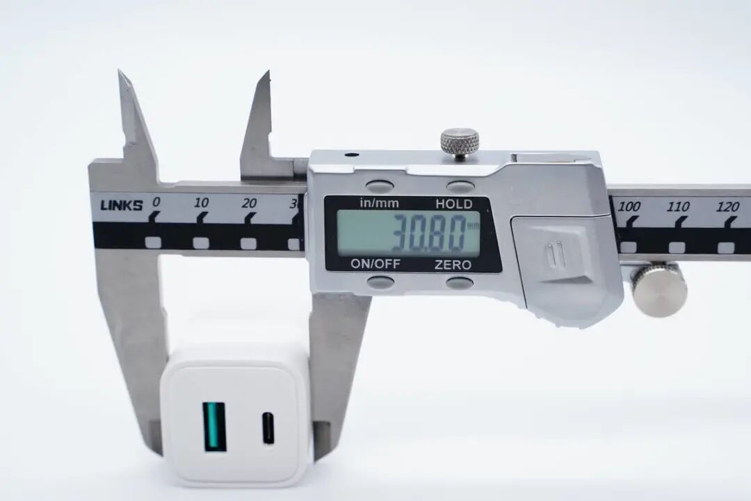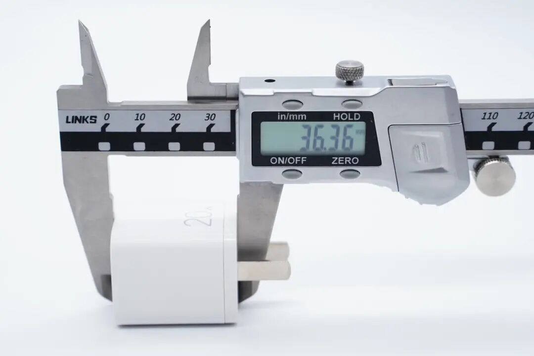 使用游标卡尺实测充电器机身高度为36.36mm。