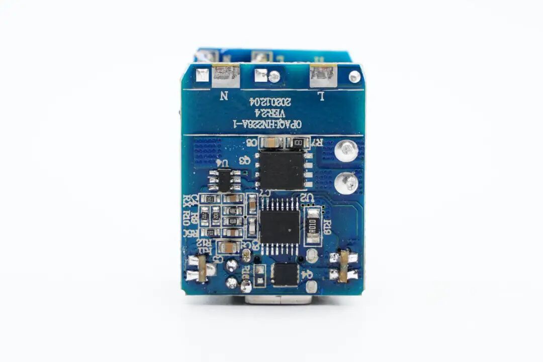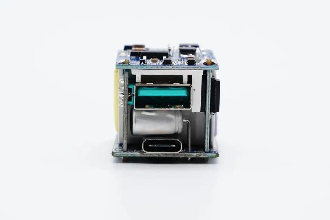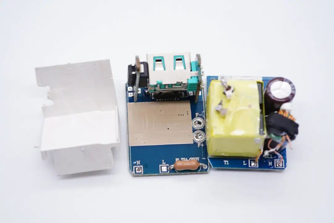 将充电器模块拆分开,USB-A口母座焊接在右侧小板上,变压器与次级之间还有塑料隔离罩绝缘。