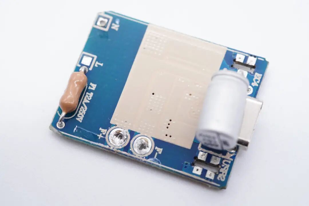 输入端小板背面设有整流桥、PWM主控芯片以及初级开关MOS管等器件。