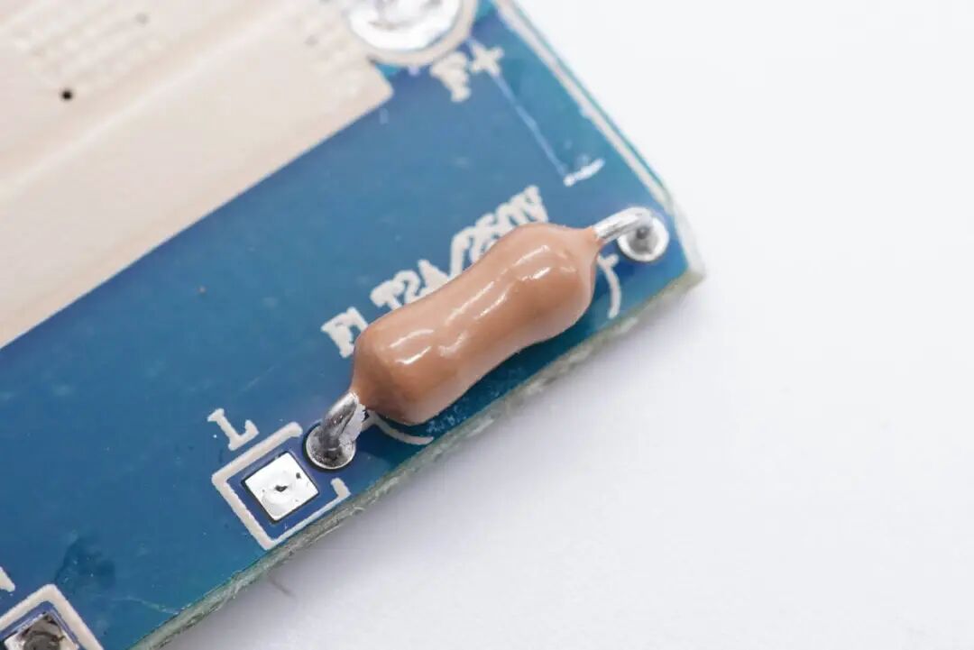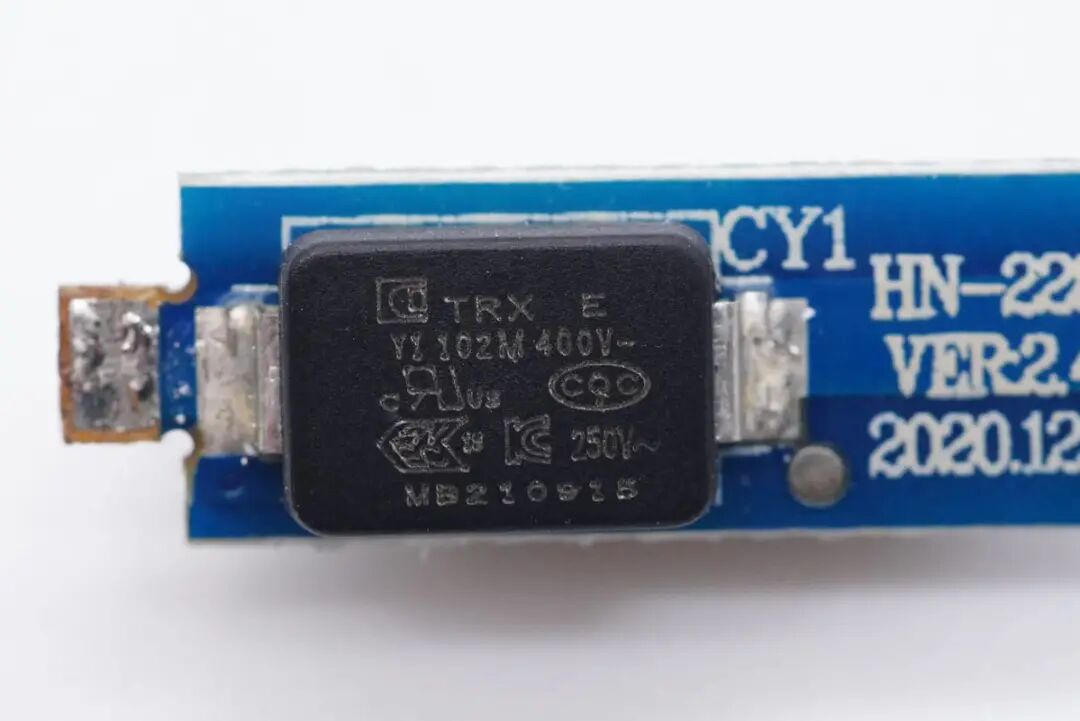 另一面设有一颗贴片Y电容,来自四川特锐祥科技股份有限公司,具有体积小、重量轻等特色,非常适合应用于氮化镓快充这类高密度电源产品中。